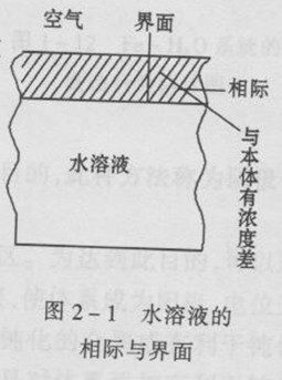一個(gè)相的表面叫作“界面”,界面的輪廓明顯,并限定在不超過(guò)一個(gè)原子層的范國(guó)內(nèi),可以看成是與另一相相互接觸的表面!跋嚯H”是指兩相之間,性質(zhì)變化的區(qū)域,寬窄不等,其范圍小至兩個(gè)分子直徑,大到數(shù)千個(gè)埃以上;其性質(zhì)與兩相中任意一相的本體性質(zhì)都有所不同,例如圖2-1所示的水溶液的相際與界面。